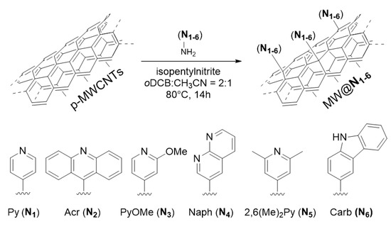 - Tuci, G.; Zafferoni, C.; Rossin, A.; Milella, A.; Luconi, L.; Innocenti, M.; Truong Phuoc, L.; Duong-Viet, C.; Pham-Huu, C.; Giambastiani, G. Chemically functionalized carbon nanotubes with pyridine groups as easily tunable N-decorated nanomaterials for the oxygen reduction reaction in alkaline medium. Chem. Mater. 2014, 26, 3460–3470. [Google Scholar] [CrossRef]