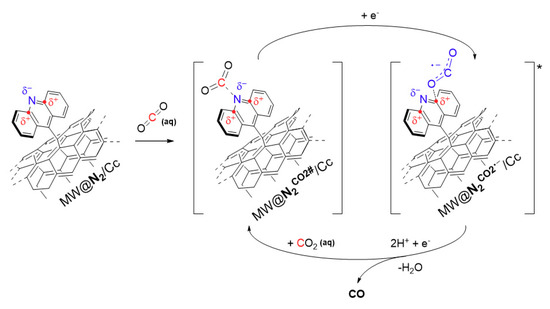 CO2 electroreduction process on model N-acridine decorated MWCNTs (MW@N2/Cc) via CO2(aq) adsorption/activation (CO2#) at the basic pyridinic nitrogen followed by a first 1e− reduction step to give the CO2•− radical ion stabilized (*) at Cα/Cα′ of the heterocycle. A further 1e− reduction produces (CO + H2O) and regenerates CO2# that closes the catalytic cycle.