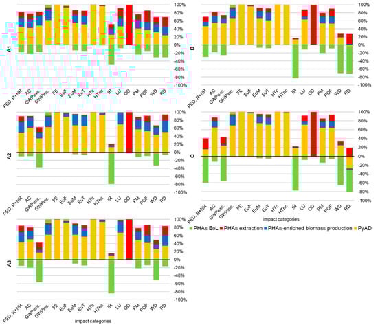 Figure 3 shows the relative contributions of PyAD, PHAs-enriched biomass production, PHAs extraction, and PHAs EoL phases.