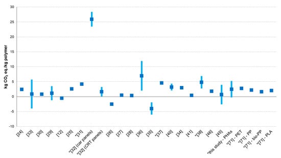 37], where carbon sources are from dedicated crops and the whole life cycle of PHB-based end products is considered. The lowest values were reported in studies where the use of organic residues as fuel to generate electricity and steam is assumed [