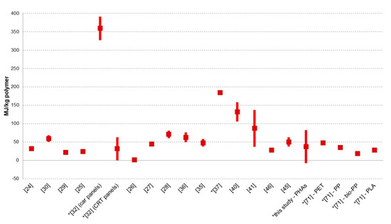 Data range from 320 to −12 MJ per kilogram of PHAs, with median values spanning between 20 to 80 MJ per kilogram of biopolymer. The present work shows values ranging from about 80 to −10 MJ per kg of PHAs, depending on the considered scenarios. The highest values were reported by Pietrini and coauthors [