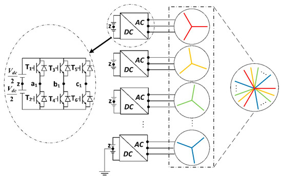 Recently, multi three-phase machines with separate neutral points controlled by parallel converters have become an increasing concern, which is shown in Figure 1 [8,16]. The adoption of parallel converters make it possible to control very high-power and high-speed machines with commercial products, since the power requirement on each inverter module is reduced. Moreover, this topology has high fault tolerance, as any inverter module is independent without any electrical connections to the other modules [6]. Besides, the adoption of the parallel converters increases the flexibility of the control algorithm. The torque ripple, noise and vibration of the machine, and the direct current (dc) link voltage ripple are possibly to be reduced by applying a proper control scheme [17,18].