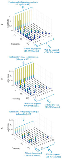 Figure 3 shows the Fast Fourier Transformation (FFT) spectra of total equivalent voltage applying the phase-shifted CPWM with normalized with three modulation indexes (, , and ). In Figure 3, the total equivalent voltage is supplied to the machine with the same rated power for any number of split three-phase systems, which means the fundamental voltage components are the same for different values of . Figure 3 presents the FFT spectra of the total equivalent voltage without the proposed CPWM (for any number of split three-phase systems) at the layer of . Conforming to Equation (13), the total equivalent voltage is combined with the fundamental component and the groups of harmonics around the multiples of switching frequency. Figure 3 displays the FFT spectra of total equivalent voltage with proposed CPWM at the layers of . Consistent with Equation (14), the equivalent voltage harmonic components are significantly mitigated, while the only remaining harmonics exist at . The larger value of will result in higher order remaining harmonics, and thus the effect of total equivalent voltage harmonics cancellation is more dominant with the increasing value of subsystem number . Comparing Figure 3a–c, it can be observed that a different modulation index affects the harmonic amplitudes to a different extent. However, the same groups of the harmonic components will be eliminated despite the modulation indexes, and thus the proposed phase-shifted CPWM method can be applied into different working conditions. Taking the case as an example, with phase-shifted CPWM, the equivalent voltage harmonics around , , , , , , , are cancelled out under all the modulation indexes.
