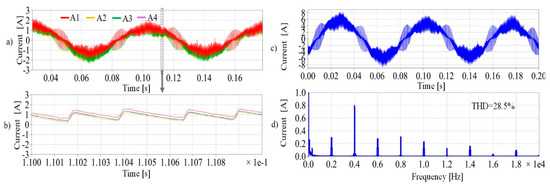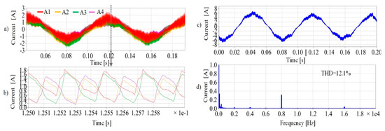 The phase currents experimental results without the proposed phase-shift CPWM are displayed in Figure 5. The carrier phase angles in each subsystem were set to be . Figure 5a shows the time-varying current waveforms (phase A) from all the four subsystems, while Figure 5b shows the cursor range of Figure 5a, which is the two-period range of the carrier signal. Figure 5a,b show that the phase currents are in phase in terms of both modulating the signal period range and carrier signal period. Figure 5c,d show the equivalent phase current and its FFT spectrum without phase-shifted CPWM.