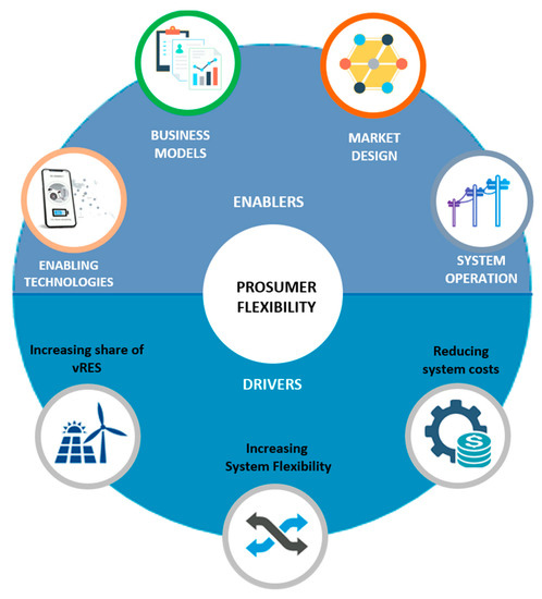 This paradigm has started to shift with the awareness that the power system needs to decarbonise and this has been largely done by the introduction of a large amount of variable renewable energy sources (vRES), mostly wind and solar photovoltaic (PV) [1,4]. The power produced from vRES cannot be dispatched and is subject to significant variation and uncertainty. This has increased the complexity of operating the power system and requires new sources of flexibility as the existing sources are no longer sufficient. The changes being experienced by the power system are shown in Figure 1. This figure shows how there are three drivers of change, which are the need to decarbonise the energy system by increasing the penetration of Renewable Energy Sources (RES), the need to reduce system costs and the need to increase the flexibility of the system. These drivers are met by four enablers of the energy transition which are novel technologies, new business models, innovative market design, and new methods of system optimisation and operation. The combination of drivers and enablers produces an ideal opportunity for prosumer flexibility to develop and become a key aspect of future power systems. In this paper, the definition of a prosumer follows from [5,6] and the concept is defined as follows: those customers who decide to invest in distributed energy resources (mostly solar PV) for a variety of reasons and now can satisfy a portion of their electricity demand and, in some hours, even produce more than they consume, possibly through storing some of the self-generated energy.