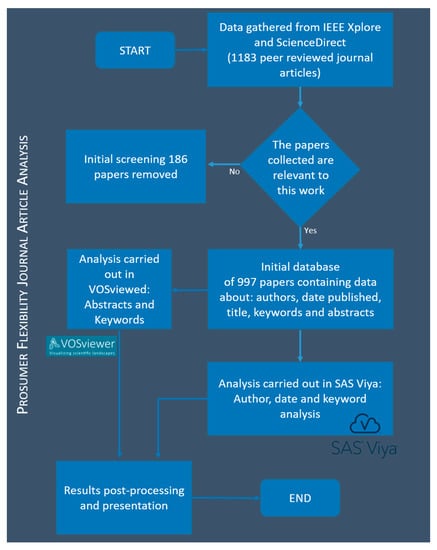 In order to present a thorough review of the current literature around prosumer flexibility, a detailed scientometric analysis was carried out. There has been a rapid increase in the amount of literature concerning prosumers and flexibility; however, a detailed analysis of this literature has not been presented. This paper uses a combination of two tools that use natural language processing, machine learning, and various linguistic rules and applies them to a large dataset containing over 1000 academically peer-reviewed articles concerning prosumer flexibility. The results of this analysis are used to inform the remainder of this paper as they provide a structure of the most relevant terms used in the literature surrounding prosumer flexibility. The methodology used in the scientometric and text analysis which was carried out to examine the data associated with the collected 1183 peer-reviewed journal articles is presented in Figure 2.