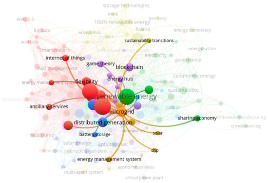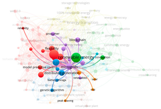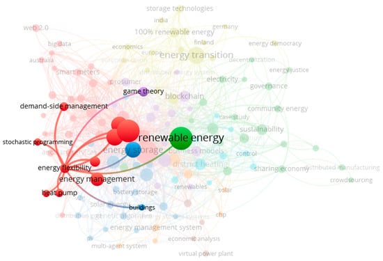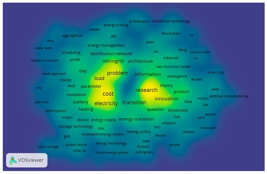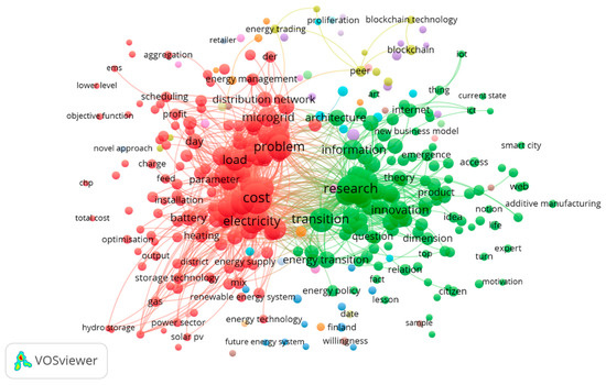 As can be expected from an abstract that aims to give a brief overview of the work, including the motivation behind the research and a summary of the results, the words identified by VOSviewer are quite generic, with the most frequent words being cost, research, and problem. Business model, load, and power system are the next most frequently used words that are more closely related to the energy system. The words are clustered into groups of words that most often appear together and, in this research, two major clusters emerge: the ‘Red’ cluster, which is more closely associated with power systems, for example, ‘electricity’, ‘microgrid’, and ‘battery’, and the ‘Green’ cluster, which is more associated with the general planning of academic research and contains words such as ‘research’, ‘innovation’, and ‘information’.