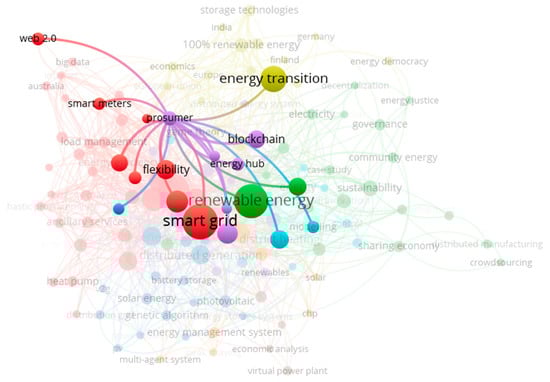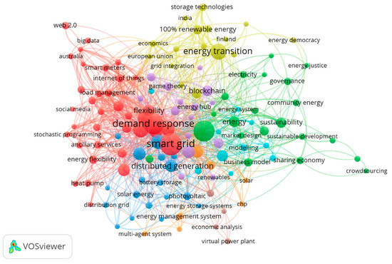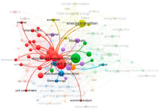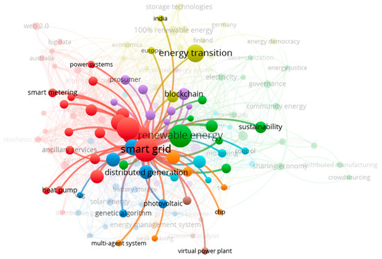 The term ‘smart grid’ was the most commonly used keyword of the 997 papers analysed. Despite the term occurring 196 times in the literature, there is no real agreed-upon definition of smart grid. Through VOSviewer, the term ‘smart grid’ was isolated and the connections to other terms are shown in Figure 12. As can be expected, it forms a central part of the keyword analysis with strong connections to several important topics in this research field.