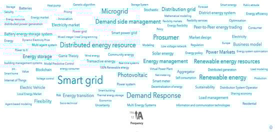 The keyword analysis conducted in SAS Viya is highlighted in Figure 10. The word cloud shows the most common keywords in all 997 papers. The size of the word represents the frequency of occurrence with the term ‘smart grid’, occurring 196 times in the papers studied.