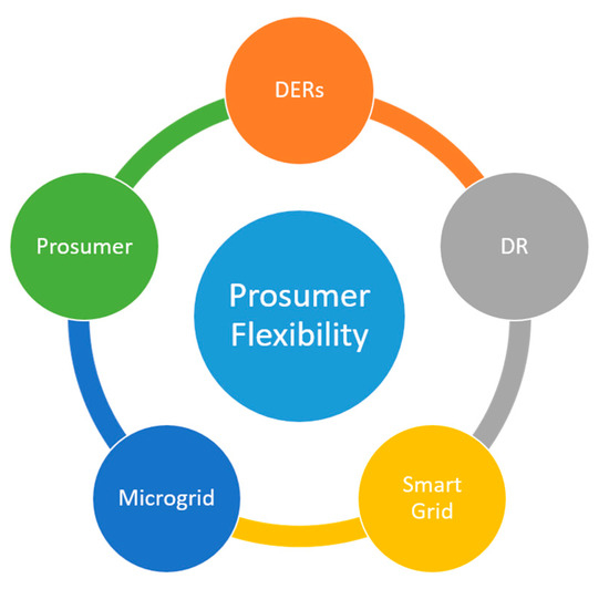 To provide a complete overview of prosumer flexibility, the top five most frequent terms used in the keywords, as analysed by SAS Viya Text analysis, are presented in the following sections. These keywords are smart grid, demand response, microgrid, prosumer, and distributed energy resources. In each of the following sections, the term is described in detail and its relation to the concept of prosumer flexibility is presented.
