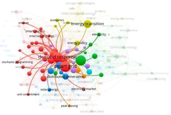 The second most frequent keyword within the studied literature was ‘demand response’. This is unsurprising as DR is a foundational concept and has been studied, for instance in [41,50]. Demand response provides flexibility to the electric system as it can alter the consumption of electricity through the use of changing prices or by offering incentives to customers to alter their load at certain times or during certain events [55,56]. The connections surrounding the term ‘demand response’ are shown in Figure 13.