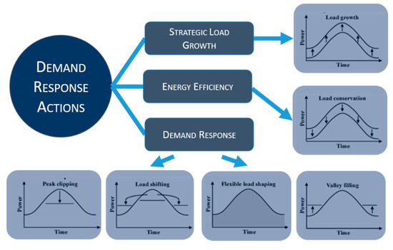 One interesting application of DR programs to prosumer flexibility is the use of aggregators to combine a large number of individual customers to gather significant flexibility to participate in existing markets. DR, through aggregation, can utilise incentive-based or price-based DR programs. Incentive-based programs can include direct load control, load curtailment, demand bidding, or emergency demand reduction programs, while price-based DR can utilise changing electricity tariffs to induce the required behaviour from consumers [56]. The use of a direct control mechanism provides the aggregator with direct control of an individual’s resources and thus allows the aggregator to be certain of the timing and quantity of energy available to participate in any market. As mentioned previously, smart meters are an essential technology not only of smart grids but also of effective DR programs. Meters will need to be able to receive and send accurate price signals to both the operator as well as the prosumer [64]. Moreover, this will be essential for aggregators to gather sufficient information about the consumer’s power usage to participate effectively in DR programs. The different effects of DR programs on the load profiles are shown in Figure 14. These include peak clippings which is a reduction in the peak load, valley filling, which incentivises power use in low demand periods to reduce the peak to average load ratio, Load Shifting, which incentivises load being moved over time from high to low periods of demand and Flexible Load Shaping, which helps to smooth out the load profile over time. In addition, there can be energy efficiency measures that aim to reduce the magnitude of the entire load profile and strategic load growth, which aims to do the opposite, i.e., to increase the load demanded.