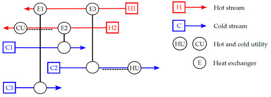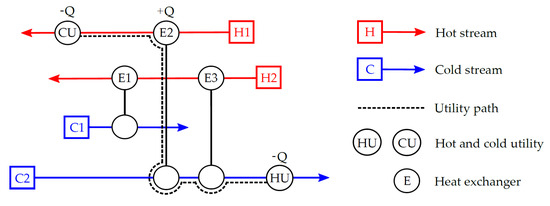 In summary, the development of methods for the retrofit of HEN, as described above, focuses primarily on the retrofit of the standard industrial HEN, i.e., such a HEN that contains at least one so-called Utility Path. A Utility Path is generally a connection between two utilities (i.e., between a cooler and heater) through process streams and one or more heat exchangers. Figure 1 shows an example of a simple HEN containing a Utility Path. To achieve the required utility loads reduction, as a primary HEN retrofit objective, exchangers to be modified must be on a Utility Path to allow heat loads to be shifted. This fundamental principle (for the design or retrofit of a HEN) was first identified by Linnhoff and Hindmarsh [26]. They also recognized that HENs are complex systems with interactions between various components. A change in one component affects the performance of the other components and the heat balance in the HEN. Some actual works use the term “Heat Path” instead of “Utility Path” (for example, Yong et al. [11], etc.).