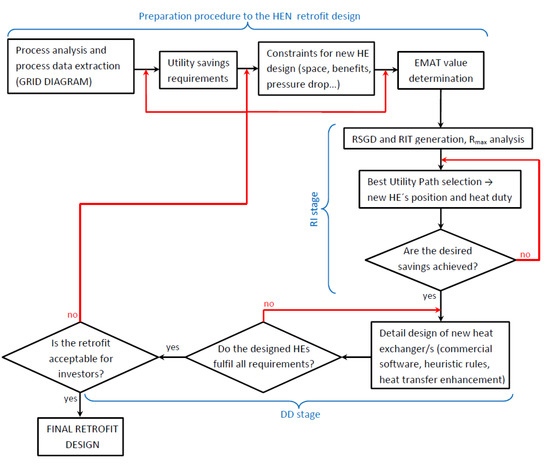 As mentioned above, the method to be now presented is developed for the retrofit of HENs not containing a Utility Path. The method is formulated as a hybrid method consisting of the following. At first, all required process data are extracted, and the retrofit goals are set. Afterwards, the so-called Retrofit Identification (RI) stage is performed. The RI stage allows finding the most beneficial Utility Path in existing HEN, where a new and optimally placed heat exchanger (HE) is to be introduced. In this stage, a combination of Network Pinch principles and mathematical programing is employed. As a result, an optimum heat duty together with the location for a new HE insertion (the most beneficial Utility Path) is identified and utility savings, as the main retrofit target, are calculated. If the desired savings are not achieved, an RI stage is applied repeatedly in a systematical manner for finding the next most beneficial Utility Path. Finally, as a result of the RI stage, the most efficient sequence of newly added HEs allowing utility loads reduction to the required level is determined. While the results of the RI stage satisfy the HEN retrofit targets (desired utility savings), the results from the RI stage are taken as input data to the following and last part of the retrofit method. The objective of this final part is a Detail Design (DD) of the newly added heat exchangers. Commercial software for HE design is used here in combination with several heuristic rules to the retrofit investment cost minimization, considering also a possibility of heat transfer enhancement employment within the heat exchanger with respect to the fluids pressure drop, fouling, or space constraints. In this work, the educational version of software Xchanger Suite® (Heat Transfer Research, Inc. (HTRI), Navasota, Texas, TX, USA) from Heat Transfer Research, Inc. (further HTRI) was used to the DD stage performing [28]. The algorithm of the whole method is presented in Figure 3.