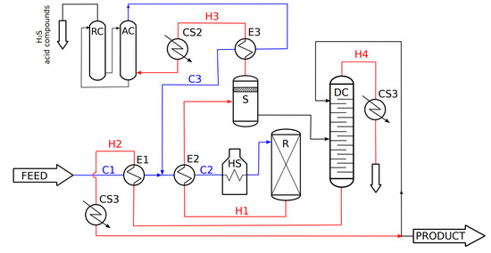 The feed stream (the oil fraction), as the stream C1, is heated up in the heat exchanger E1 by the hot process stream H2. Afterward, the feed stream is mixed with hydrogen (stream C3), and the resulting mixture (stream C2) is heated up in the exchanger E2 and in the process furnace to the temperature 289 °C and enters the reactor R, where hydrogenation reactions take place. The hot product from the reactor (stream H1) is used to preheat the feed and hydrogen mixture in exchanger E1 and then continues to the separator, where the so-called Hydrogen Gas, composed of the unreacted hydrogen, hydrogen sulfide, and acid compounds, is separated from the product stream. Hydrogen Gas (stream H3) is cooled down (in heat exchanger E3 and cooler CS2) and cleaned of the sulfur and acid compounds in the absorption unit, AC. The purified stream containing mostly hydrogen is then brought back, as a stream C3, to the feed stream entering the process.