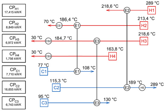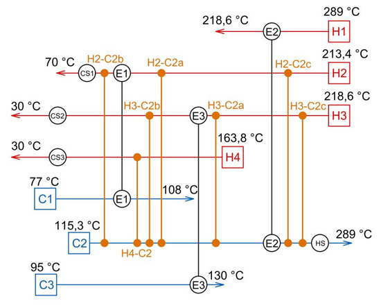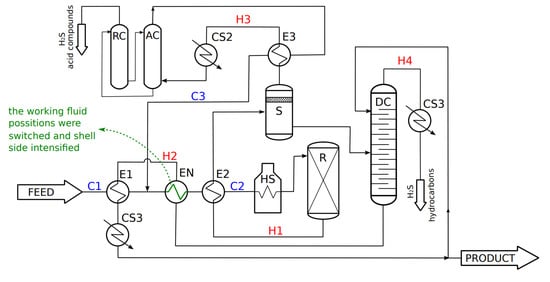 The results of the RI stage are further used as input for the DD stage of the retrofit method procedure. First, the simulation scheme of the studied process was compiled, taking into account the results from the RI stage of the HEN retrofit. This scheme is illustrated in Figure 8.