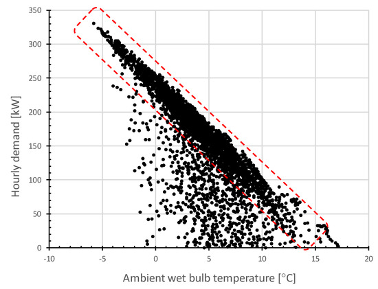 Figure 1 displays the hourly demand for each ambient wet bulb temperature (Wet bulb temperature is used as a measurement of the enthalpy of humid air). It shows a cloud of points following a linear regression curve (enclosed in a red dashed line), along with a set of disperse data with lower heating demand. The data density increases with the temperature, in agreement with the radiation issue previously explained.