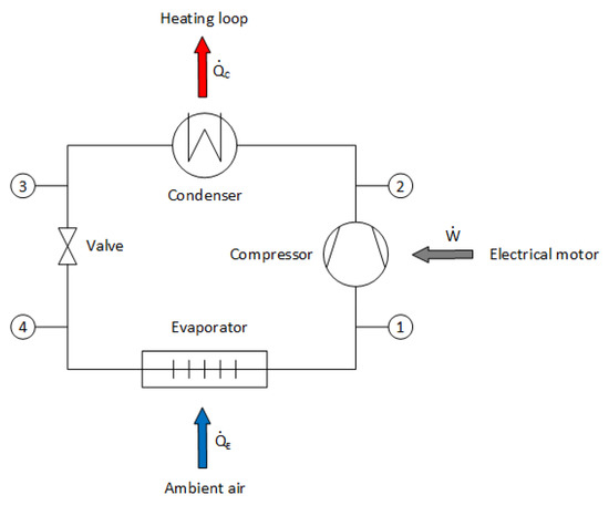 Figure 3 shows a scheme of the heat pump. An adiabatic reciprocating compressor is chosen, in accordance with actual commercial trends [52]. The isentropic efficiency (Equation (7)) is used to model the compressor and the polytropic exponent (n) can be obtained, as shown in Equation (8). The volumetric efficiency (ηv, Equation (9)) is used to set the refrigerant mass flow rate. In Equations (7)–(9), h stands for enthalpy, s entropy, p pressure, v specific volume, vs. swept volume, r pressure ratio, and α relative clearance volume.