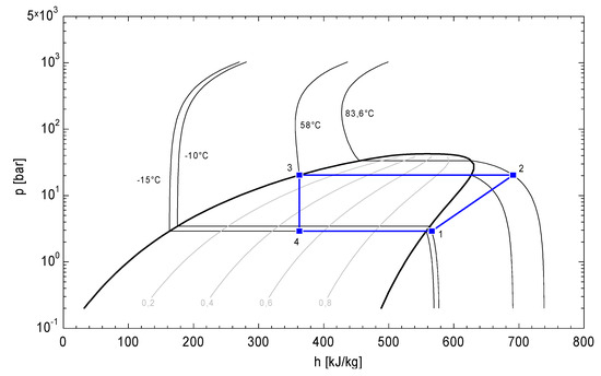 The refrigerant must comply with regulations about the global warming potential (GWP) and ozone depletion potential (ODP) [11] of the European Union. Accordingly, R-290 (propane) is chosen as fluid valid for long term, due to the fact that it is a natural refrigerant with null ODP and a GWP value of 3. On the other hand, it is included in the A3 class of the flammability safety classification (ASHRAE), thus considered highly flammable. Figure 4 shows the pressure-enthalpy diagram for R-290, where the assumptions previously stated for the best efficiency point are represented. This diagram shows that the compressor discharge temperature is not too high and the de-superheating interval is small (around 20% of the overall heating capacity). Both of the values are in accordance with the fact that domestic hot water is heated by using other procedures.