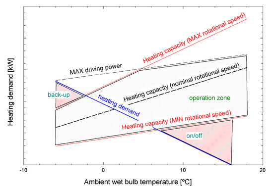 Once the hourly heating demand (Equation (6)) and the heat pump performance (Equations (22) and (24)) are determined, the map of the device coupled to the demand can be obtained, producing a diagram similar to the one that is shown in Figure 5. In this chart, the heating demand only considers the linear regression curve for the sake of clarity. At the nominal rotational speed, a positive slope line determines the heating capacity of the heat pump for each temperature. This line cuts to the heating load line in one point. To modulate the response of the heat pump, the rotational speed is varied, therefore sweeping the operation zone and cutting to the load curve in a large range. For temperatures out of that range, the back-up system operates (if the load is higher than the heat pump capacity) or the machine is operated in on/off mode, in order to adapt the excess of capacity to the low demand.