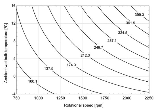 Figure 6 shows the iso-lines of heating capacity as a function of the rotational speed and the ambient wet bulb temperature. The limitation of maximum electrical power (Equation (25a)) has been taken into account.