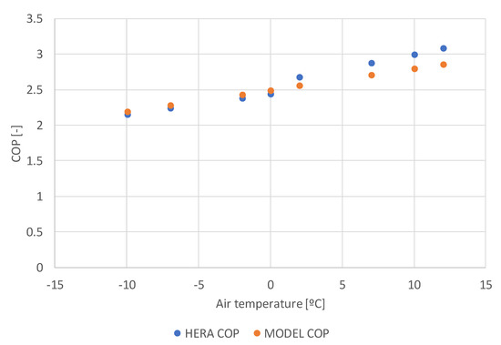 Comparison between the coefficient of performance (COP) obtained with the model and the COP of HERA 190-2-2 from EUROKLIMAT.