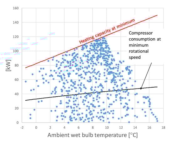 Thermal demand points in on/off operation mode versus the ambient wet bulb temperature. Heating capacity and compressor consumption at minimum rotational speed are also plotted.
