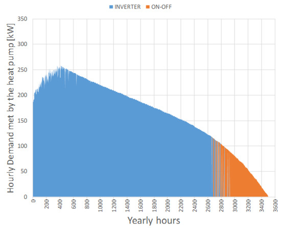Thermal demand met by the heat pump at inverter control mode and on/off one.