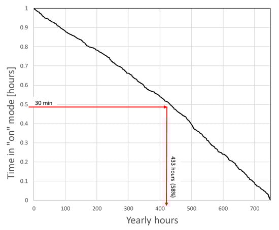 At low thermal demands, the heat pump is controlled in on/off mode due to the minimum rotational speed limit. This type of control causes important energy losses when an inverter is not available, but this driving control is expected to reduce them. Accordingly, Figure 9 shows the cloud of points for the thermal demand under the minimum heat capacity line. Once these points are sorted and moved into the ASHPWH contribution to the annual cumulative heating demand profile, they take up the end tale of the distribution (Figure 10), accounting for 8% of the overall demand that is met by the heat pump. Figure 9 also shows that the motor consumption ranges between 31.2 to 49.9 kWe (41 to 65.5% as compared to the consumption at design point). This allows for us to assume that low current peaks will take place in the startups and, moreover, they also will be smoothed by the use of the speed modulation. On the other hand, the ratio of the thermal demand to the minimum heating capacity of the heat pump at each hour determines the time fraction when the heat pump has been working over that hour. Figure 11 shows this ratio, after being sorted. It can be observed that in 58% of the time when the heat pump was working in on/off mode was “on” more than 30 min (hour fraction 0.5), therefore minimizing the transitory effect on the components of the heat pump. In summary, the availability of the inverter is expected to significantly contribute to reducing the energy losses of the on/off operation mode and, consequently, it make sense to neglect it for the scope of the current analysis.