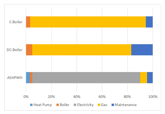 Figure 12 shows the breakdown of the levelised costs that are given in Table 9. As the demand and the heated area are established, the percentage breakdown is the same for both levelised costs (see Equation (29a,b)). Moreover, Figure 12 points out the predominance of operating costs (especially the energy term, being the maintenance less significant) over investment (heat pump and boiler).