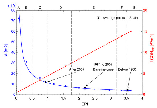 The baseline case has been selected to be representative of the middle-energy efficiency level pool of dwellings, with an energy performance assessment of E, close to D (EPI = 2.18). However, in the context of energy poverty, it is usual to find dwellings built before 1980 with worse insulation condition than this middle energy-efficiency-level. In these cases, an energy retrofitting of the dwelling is recommended, which makes it possible to reduce the heating cost per dwelling. To assess this fact, Figure 13 has been obtained, varying EPI and maintaining the levelised cost of heating in demand base with the same value as the baseline case. This condition requires varying the heated area, obtaining a potential fitting curve (Equation (34)). In Figure 13 the average EPI obtained for dwelling blocks in Spain have been represented over such fitting curve, so obtaining their heated area to maintain the same levelised cost than in the baseline case.