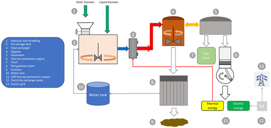 Depletion of natural energy resources is compelling our planet to face crucial challenges. Hence, energy production from biowaste plays a critical role in this energy transition [1,2,3,4,5,6,7,8]. In waste management, anaerobic digestion (AD) is a widely implemented technology that has recently drawn attention due to its capability to produce sustainable energy [9,10,11,12,13,14,15]. Biogas from AD is a renewable energy-carrier that can substitute conventional fuels in terms of heat and power generation, in the transport sector as biomethane or even for production of biochemicals [16,17]. Despite recent progress in the exploitation of biomethane in the transport and heating sector, Italy’s greatest use of biogas has been in the generation of power. Biogas power installed in Italy increased from 2009 to 2016 from 359 to 1352 MW, while electricity generated increased from 1665 to 8259 GWh [18]. In these years, power generation from biogas placed the third position in renewable energy after photovoltaic and wind power excluding hydroelectric power which is a conventional energy resource in Italy.