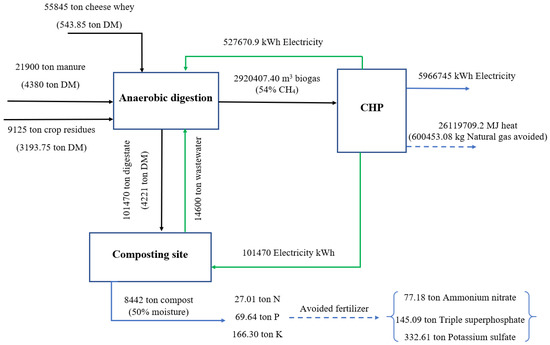 The electricity consumed in the feeding operations accounts for 8% of the total electricity production. As regards the electricity consumption for the composting plant, it is assumed that 1 kWhe is required per ton of wet organic waste as from literature data [59], and this electricity is withdrawn from the grid. Compost is a composition of N, P and K elements in different concentrations, also present in mineral fertilizers. Hence, the compost can substitute mineral fertilizers (e.g., ammonium nitrate, triple superphosphate and potassium sulfate) in terms of active ingredient contents [60,61]. Therefore, production of theses fertilizers is avoided as in other fields such as biochar application in soil as organic fertilizer [62]. Airborne and waterborne emissions (ammonia, nitrous oxide, nitrogen, nitrate and phosphate) arising from digestate application are excluded from this study as they are neutral in global warming potential. In the case of composting plant wastewater, a supply of about 100 days year−1 was considered. In addition, a storage with 20,000 m3 capacity was assumed for green crop residues due to their seasonality. Cattle farms and dairy factories are within a 20-km radius of the AD power plant, while crop residues are transferred to the plant from a 30-km distance. Carbon dioxide emissions from biogas combustion in the CHP are also excluded from estimation owing to biogenic exemption [27,63,64]. Furthermore, greenhouse gas emissions deriving from the construction, operation and disposal of the plant was not taken into account. Excess heat from cogeneration on top of internal energy requirements was used to match local heat demand and substitute natural gas fuel. The mass and energy flow of the proposed system during 1 year of operation are illustrated in Figure 2. The overall list of energy and material used for 1 MWh electricity production from co-digestion plant is also presented in Table 1. The exploitable heat was not computed between the outputs of Table 1 because it is included among the avoided products as natural gas.