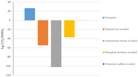 Global warming potential (GWP) was quantified by IPCC 2013 method converting GHG emissions to kilograms of CO2. For the studied system, the global warming potential was found to be −167.52 kg CO2, representing an outstanding carbon offset (Figure 3). Negative values reflect environmental benefits achieved by avoidance of product uses [62]. These benefits were primarily associated with avoided mineral fertilizers consumption.