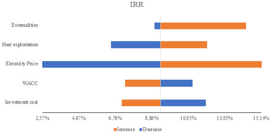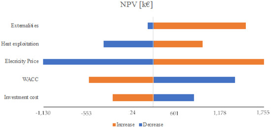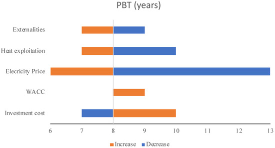 Furthermore, a sensitivity analysis aimed to appreciate the response of the economic model to variation of the most impactful parameters was developed and represented by means of a tornado diagram in Figure 4, Figure 5 and Figure 6 for NPV, PBP and IRR, respectively. Parameters were varied within the following realistic and interesting ranges. Percentages of variation of each considerable parameter were: ± 10% for the investment cost, ± 25% for the WACC, ± 25% for the electricity price, ± 30% for the thermal energy exploitation, while the externalities were varied between the minimum value attainable by the ecotax method corresponding with 11.58 €/MWhe and the maximum value attainable by the ecovalue method corresponding with 38.37 €/MWh. The tornado diagrams are centered on the values shown in Table 2.