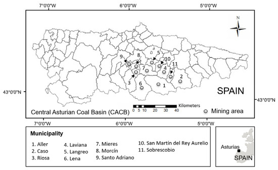 The National Renewable Energy Action Plan (NREAP) in Spain is aimed at complying with European Directives 2009/28/EC and 2009/29 EC on the contribution of renewable energy and the reduction of greenhouse gas (GHG) emissions by 2020 [3]. Located in the north of Spain, the Principality of Asturias is an Autonomous Community where 45% of the land is forested. The energy structure of the Principality of Asturias is conditioned by the contribution of fossil fuels to the national energy system as a whole. The Central Asturian Coal Basin (CACB) spreads over the southern councils of the central area of the region (Figure 1).
