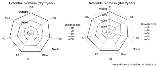 In Phase 1, the analysis model established by the multiphase mathematical algorithm (Figure 2) shows the quantities of both potential biomass and available biomass in the study area for each of the nodes considered, as shown in Figure 3.