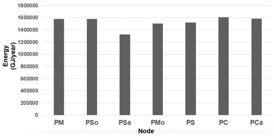 Biocoal could replace coal in the production of heat and power through energy production systems. It would also have a large impact on industry [43]. Providing the infrastructure, technology and research to enable the use of renewable energy sources available “on site” is a challenge for industry, in particular for readily available sources such as biomass [38]. The continued development of industrial technology is expected that will ensure more competitive, reliable and sustainable energy production systems [44]. The use of biomass as an alternative to coal in certain contexts has been made feasible by using biocoal technology, but advances in technology alone do not promote its widespread use; therefore, extensive studies are needed. In this sense, from the mass and energy balance of the analysis model, the optimal node appears to be PC, this is selected as the optimal node for the CACB. With the use of a roasting system, this node would produce about 84 kt/year of biocoal, equivalent to 1544 TJ/year of biocoal, the largest amount of all the nodes selected in the proposed analysis.