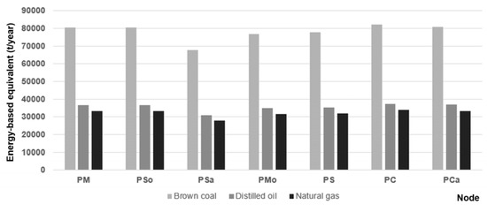 For each node, the amounts of the available biomass that can be collected are above 75 dry kt/year, around 1300 TJ/year. The available biomass will be used as raw material to be converted into biocoal (Figure 4).