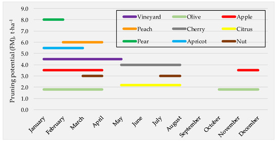 - Pari, L.; Alfano, V.; Garcia-Galindo, D.; Suardi, A.; Santangelo, E. Pruning biomass potential in Italy related to crop characteristics, agricultural practices and agro-climatic conditions. Energies 2018, 11, 1365. [Google Scholar] [CrossRef]