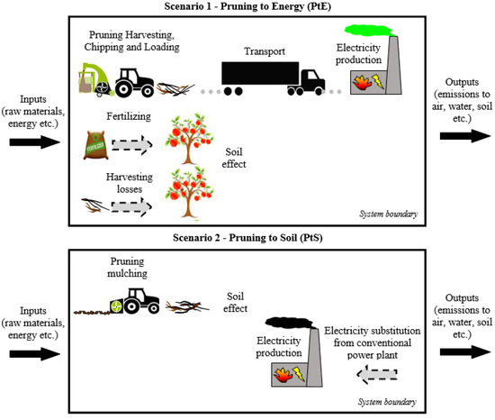 System boundaries both scenarios: pruning to energy (PtE, Scenario 1) and pruning to soil (PtS, Scenario 2).
