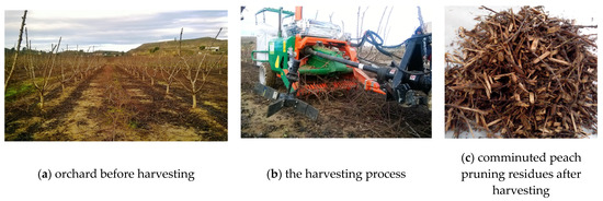 Pruning harvesting in the peach orchard (PtE scenarios). (a) orchard before harvesting; (b) the harvesting process; (c) comminuted peach pruning residues after harvesting.