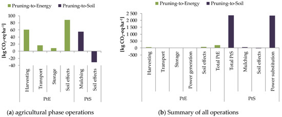 In Figure 4 the comparison of the Climate Change Potential impact for Pruning-to-Energy and pruning-to-soil scenarios is shown. The agricultural operations (cradle-to-gate) are first shown separately (Figure 4a), followed by the overall picture including the energy generation phase (Figure 4b). The values of Figure 4a are a magnification (see a difference in scale) of the first part of the values in Figure 4b.