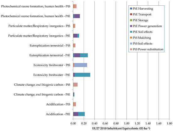 In general, the impact category Acidification is related to a limited number of emissions only. In the PtE scheme, the foremost contributors are NH3 emissions caused by additional artificial fertilizers application (1.2 × 10−1 IE·ha−1) and the emission of nitrogen oxides caused by the incineration of the PPR (7.9 × 10−2 IE·ha−1). In the PtS scheme, the impacts are dominated by mainly Sulphur dioxide and, as a smaller contributor, by the emission of nitrogen oxides from the hard coal incineration for power generation (6.2 × 10−1 IE·ha−1).
