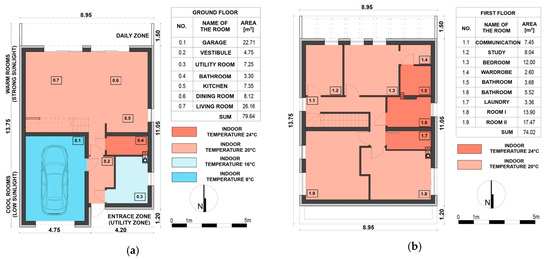 The house was designed for a 2 + 2 family model with seven rooms on the ground floor and nine rooms the first floor (Figure 1); the building’s shape factor was 0.98 m−1.