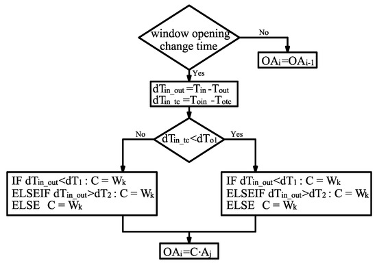 - the window will be opened if the room has poor thermal comfort (the temperature is too high). The adaptive comfort model based on the EN15251:2007 standard [31] was adopted in this paper. Therefore, the comfort parameter will be the operative comfort temperature (Totc). The difference between the operating room temperature (Toin) and Totc (dTin_tc = Toin−Totc> 0) will indicate if the room temperature is too high in relation to the optimal (comfortable) temperature. For larger dTin_tc values, the window will be opened further than for small values,