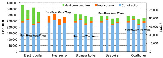 The most advantageous solution in terms of the overall (construction + heat source) valuation was a standard wooden house WSTD with a coal boiler. Brick houses generate higher costs compared to wooden houses (Figure 6), with a similar tendency in each variant; this was independent of the heat source. For example, when considering the BSTD and WSTD buildings with an electric boiler, the LCC value was about 5% higher for the BSTD; this was mainly due to the higher construction costs in this case. The largest share of the construction costs in the total LCC was calculated for the BPASS and WPASS buildings. The costs incurred in erecting a BPASS building with a coal or gas boiler accounted for 88% of the total LCC (87% for the WPASS). The higher the requirements for thermal insulation that are imposed on the buildings, the higher the share of the cost of the building’s construction in the LCC. This is due to the higher costs of the materials, but also the reduced operating costs for heating (lower heat demand due to the improvement of the insulation parameters).