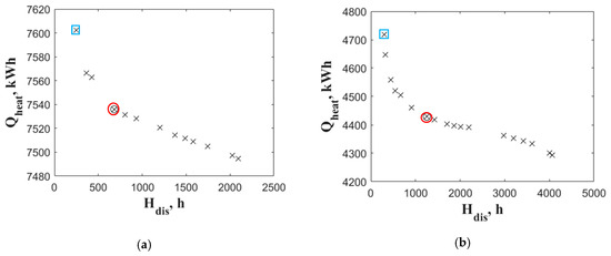 As a result of the multi-criteria optimization, a set of non-dominated solutions (Pareto front) was obtained. From these, the most advantageous configuration was chosen (Multi-Criteria Decision Making—MCDM); this can be done in many ways. In this study, the utopia point criterion was analyzed: the best configuration of this lies closest to the ideal solution (utopia point—solutions for which both functions are minimized); such a result is very often taken into account in technical analyses. The results given later in the article (Hdis, Qheat) have been correlated with this optimal solution.