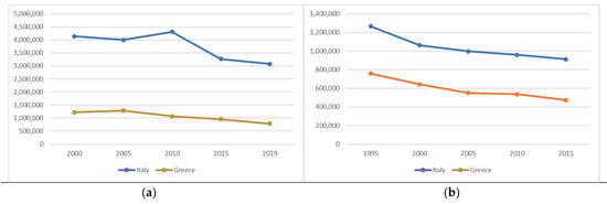 Reduction of agricultural cultivated area (in ha): (a) 2000–2019 and agricultural jobs; (b) 1995–2015 [26]) in Italy and Greece.