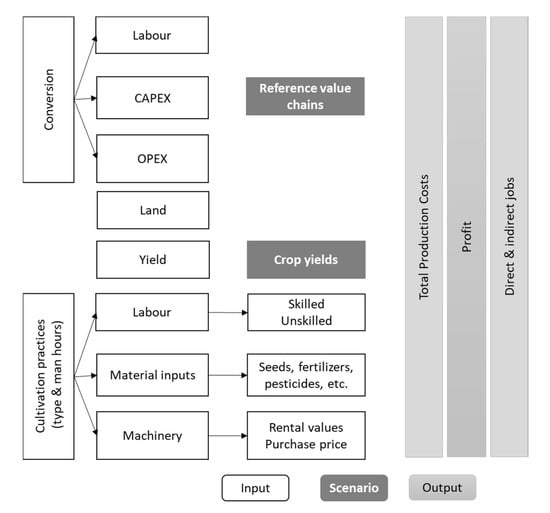 An econometric model has been used and tailored to calculate jobs across the value chain stages [55]. The methodological approach is based on input output (IO) analysis for activities in the relevant stages of the value chain [56]. The tables include technical and cost data, drawn from statistics, literature and expert opinion, for relevant activities, labour, materials and equipment at national, regional, and local (i.e., implementation) levels and describe flows in monetary terms across the value chain. The IO tables are divided into two main value chain components: (i) feedstock production (including logistics) and (ii) conversion technology (Table 3). Detailed information on the cost components, technical and economic input is presented in Appendix A.